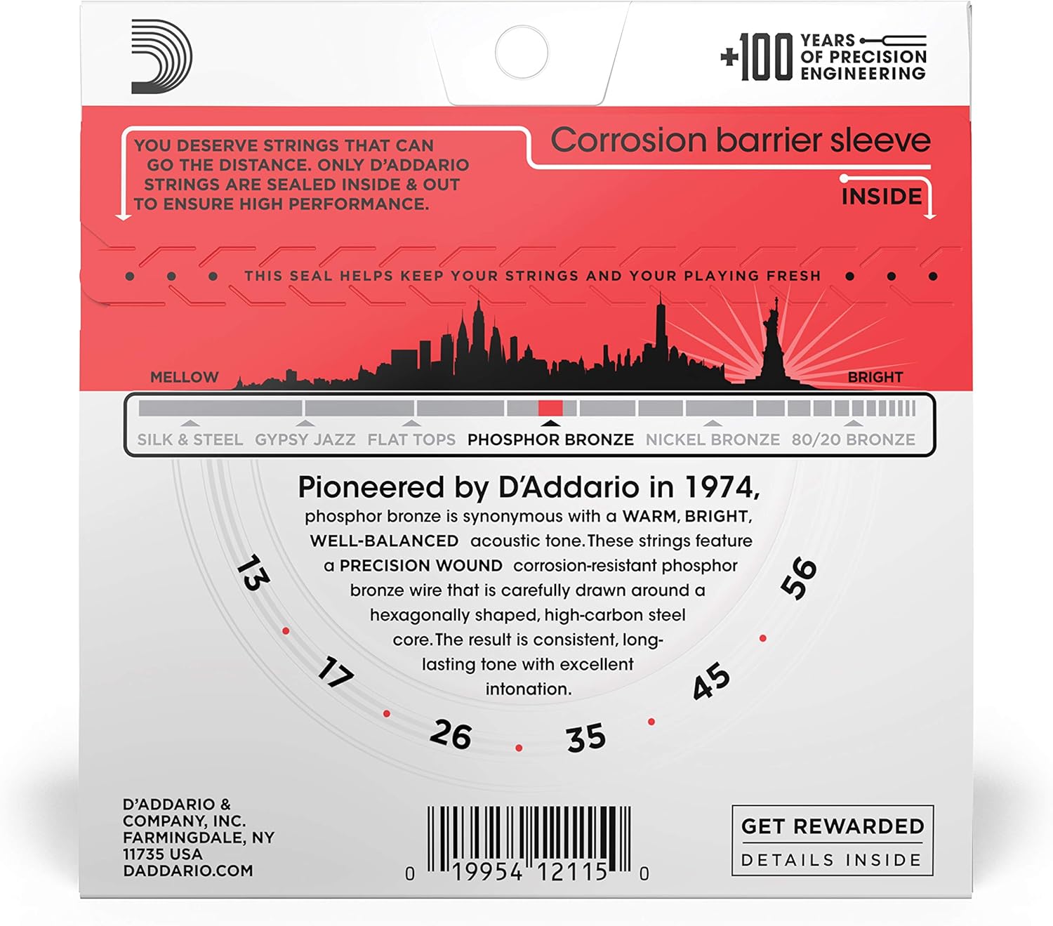 - Phosphor Bronze wrap wire provides tried-and-true D’Addario acoustic tone, with beautiful balance and warmth suitable for all musical genres.