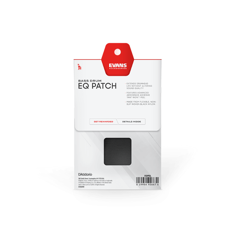 EVANS EQPB1 is a black non-slip flexible nylon bass drum patch which softens attack and strengthens the head without affecting sound quality.