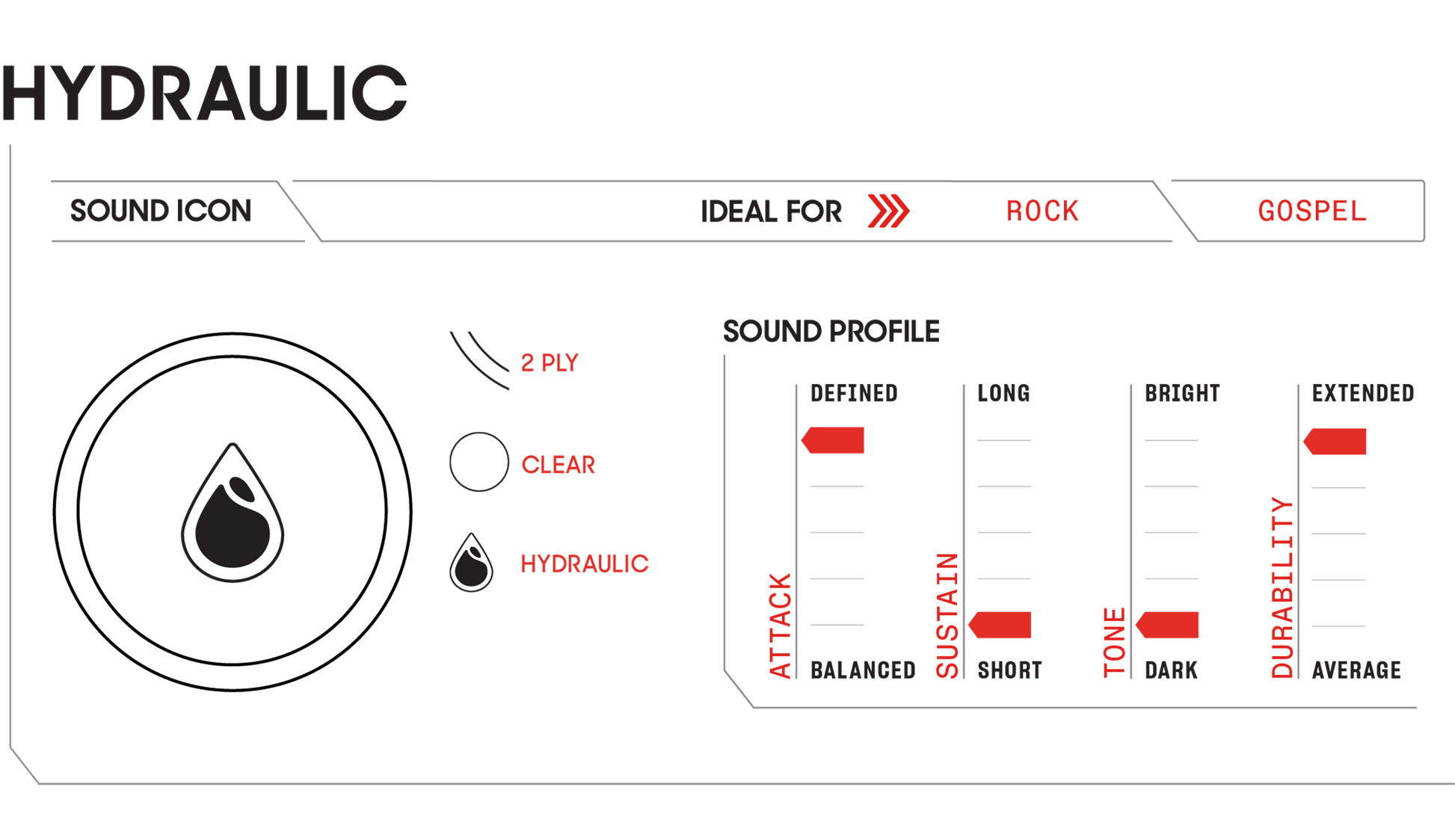 EVANS Hydraulic snare batter heads give you the fat, deep, short sound pioneered by rock and roll drummers in the 1970s. Made with a thin layer of oil between two plies of 7 mil film (6.5mil & 7.5mil for Hydraulic Black), these frost coated heads not only suppress unwanted overtones, but are also famously easy to tune. Hydraulics have a defined attack, short sustain, and dark tonal character—plus extra warmth, focus, and depth, thanks to Evans frost coating. This coated drumhead also features Level 360 Technology and is available in red, blue, and black.