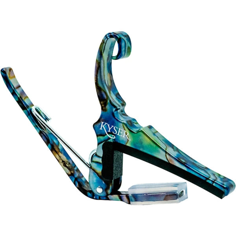 The Kyser Quick-Change capo is an innovative capo that allows guitarists to swiftly switch between keys without re-tuning. Featuring a trigger-release mechanism, the Kyser Quick-Change capo can be attached and removed from the fretboard in a matter of seconds. Its dual-action clamping system ensures even pressure across all six strings for buzz-free play. Constructed from aircraft-grade aluminum, the Kyser Quick-Change capo is built to last through years of heavy use on stage or in the studio. The Kyser Quick-Change capo is ideal for guitarists seeking a high-quality capo for rapid key changes and tuning adjustments.